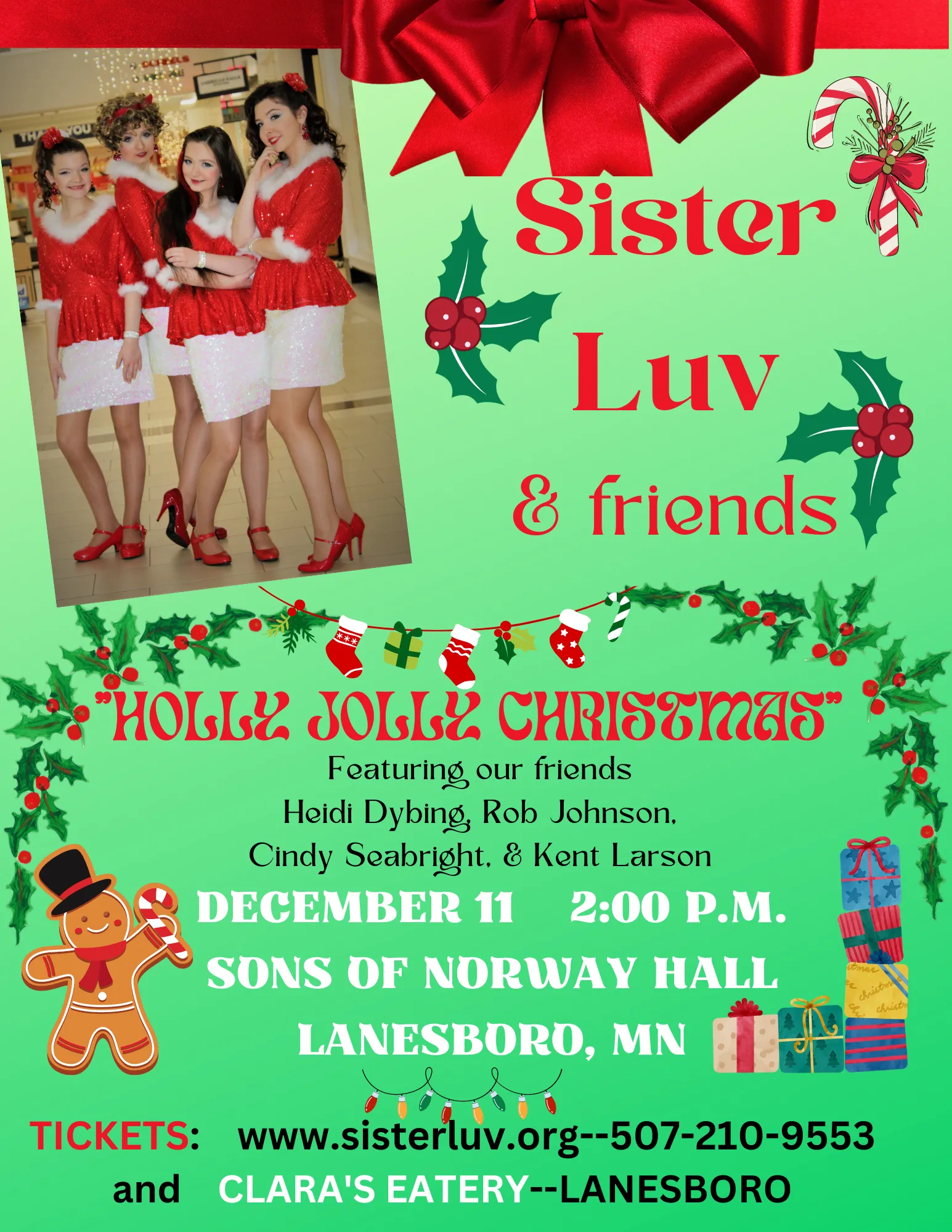 TODAY IS THE TODAY!!! We hope to see YOU at Sister Luv & Friends ~ "Holly, Jolly Christmas" ! We have so much Christmas fun planned for this show...We would Luv to share this Beautiful, Sunday afternoon with you and your family, enjoy the Joy of Christmas!!! Tickets are still Available online at https://www.sisterluv.org/event-info/sister-luv-friends-holly-jolly-christmasOR there will be tickets available at the door!Clara's Eatery is not open today, so unfortunately you cannot get them there...BUT there are still options to ensure you get a seat for this Christmas Extravaganza!